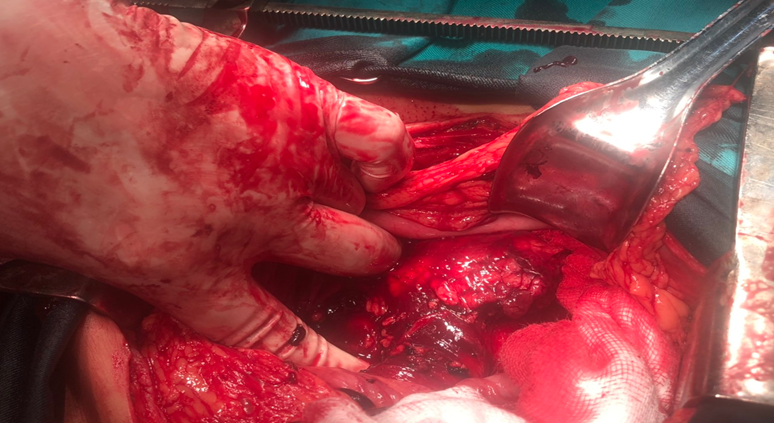 Phẫu thuật 2h20 ngày 11/09/2020. Kiểm tra thấy ổ bụng toàn máu không đông hút ra khoảng 1500ml, nhiều máu cục hậu cung mạc nối (khoảng 500ml), bầm dập vùng tụy và mạc treo đại tràng ngang. Ruột non, dạ dày, đại tràng, gan, lách bình thường. Mở bao tụy phát hiện tụy đứt đôi thân tụy chia tụy thành 2 phần.