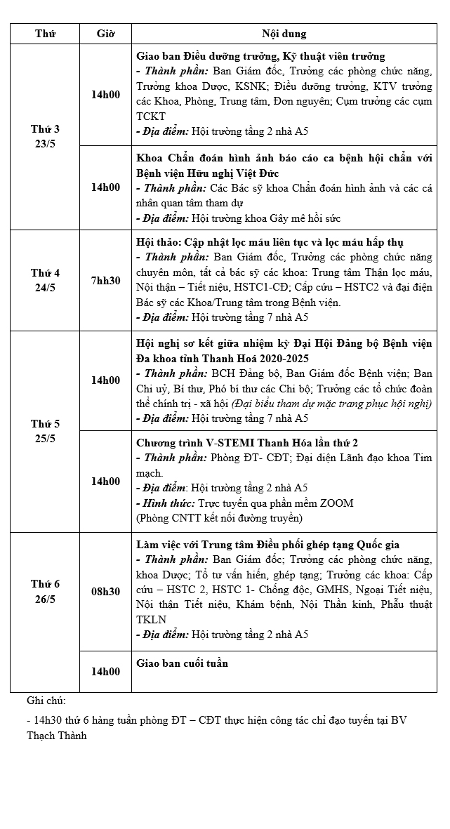 Lịch công tác tuần từ ngày 22/5/2023 đến ngày 26/5/2023 Tài liệu đi kèm:Lịch công tác tuần (File word)