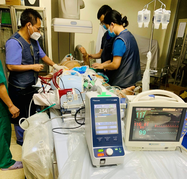 Sau 30 phút cấp cứu ngừng tuần hoàn nâng cao, bệnh nhân đã tái lập tuần hoàn, sau đó được chuyển vào khoa Hồi sức tích cực 1 – Chống độc trong tình trạng rất nguy kịch, suy hô hấp nặng phù phổi, bọt hồng trào qua ống nội khí quản, huyết áp phụ thuộc vào 3 loại thuốc vận mạch liều rất cao, khí máu toan chuyển hóa nặng, nồng độ oxy máu rất thấp P/F 64, SpO2 65-70%, bệnh nhân có nguy cơ ngừng tuần hoàn trở lại và tử vong rất cao. Để kịp thời cứu chữa cho bệnh nhân, các bác sĩ đã hội chẩn cấp cứu và quyết định sử dụng kỹ thuật ECMO để hỗ trợ tim phổi và hạ thân nhiệt chỉ huy để bảo vệ não cho bệnh nhân.