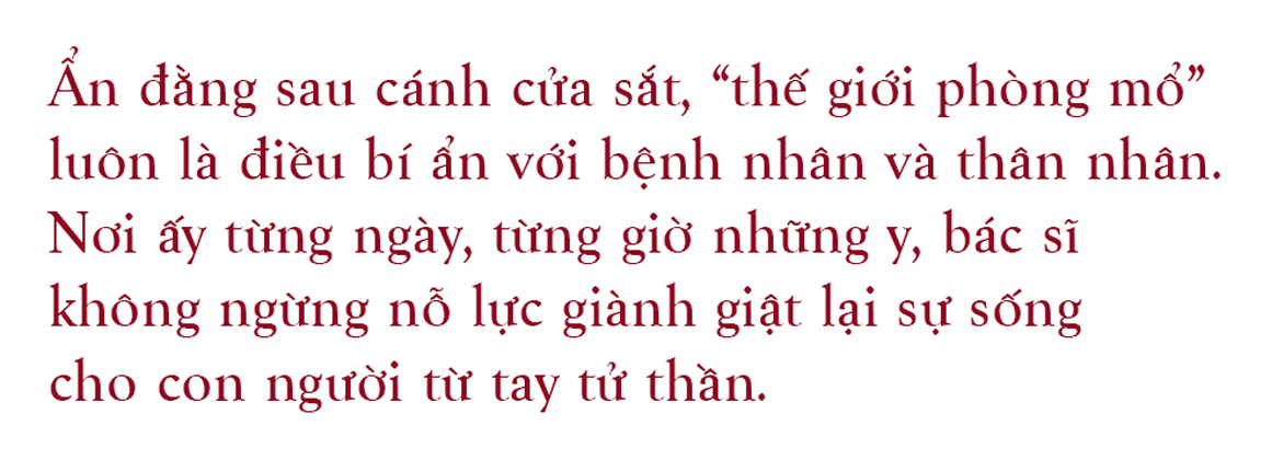 Sự căng thẳng cùng giàn đèn mổ sáng trưng chiếu rọi khiến thi thoảng điều dưỡng lại dùng gạc thấm những giọt mồ hôi trên trán phẫu thuật viên. Một vài người thường xuyên đứng phía đầu giường mổ, người dán mắt vào màn hình biểu hiện những chỉ số sinh tồn của người bệnh, người chăm chú quan sát gương mặt bệnh nhân. Tất cả phối hợp vô cùng nhịp nhàng. Tuy bịt kín mặt, trang phục giống nhau, nhưng chỉ cần bằng ánh mắt, người phụ trách dụng cụ cũng hiểu được phẫu thuật viên chính cần lấy dụng cụ gì.