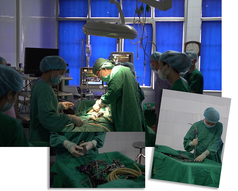Sau câu trả lời nhanh gọn không kém của bác sĩ gây mê, ca phẫu thuật bắt đầu. Dưới ánh đèn, bác sĩ Kỳ và bác sỹ Tạ Quang Chiến, khoa Gan – Mật tiến hành mổ nội soi cắt túi mật và lấy sỏi ống mật chủ cho bệnh nhân.