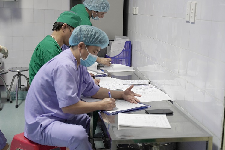 Y tá trưởng Trịnh Quốc Lâm, Khoa Gây mê – Hồi sức, hướng dẫn chúng tôi thay y phục phòng mổ và dặn: “Vào phòng mổ, mọi người tuyệt đối không được đến gần bàn mổ, hạn chế di chuyển để tránh va vào bệnh nhân và các dụng cụ y tế”.