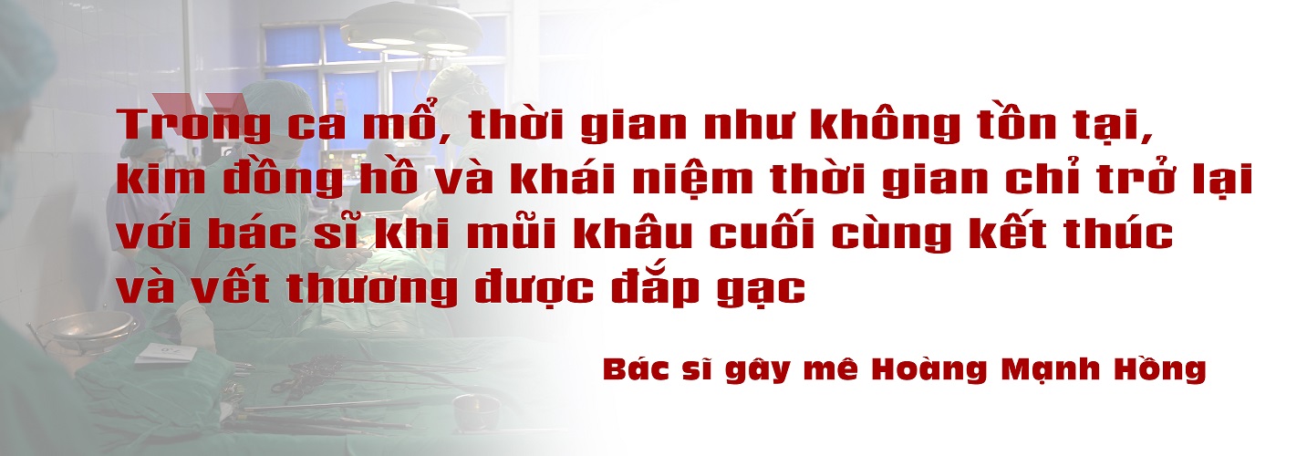 Bệnh viện Đa khoa tỉnh Thanh Hóa là bệnh viện tuyến đầu của tỉnh, một ngày có 60 – 70 ca phẫu thuật. Ca mổ nhanh khoảng 30 phút, những ca lâu có khi đến 6 – 8 tiếng. Bác sĩ Hồng chia sẻ: “Thời gian không phải là yếu tố quyết định lúc nào bác sĩ được nghỉ ngơi, mà chính là ca mổ và bệnh nhân quyết định. Trong ca mổ, thời gian như không tồn tại, kim đồng hồ và khái niệm thời gian chỉ trở lại với bác sĩ khi mũi khâu cuối cùng kết thúc và vết thương được đắp gạc”.