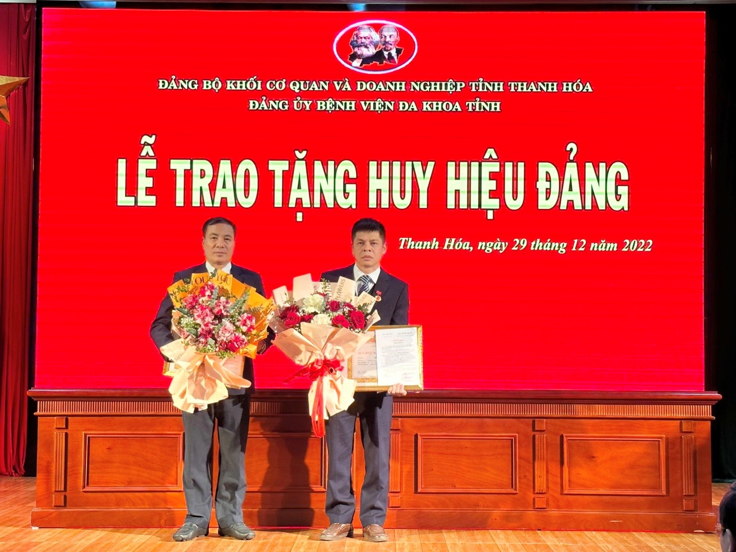 Ngày 29/12/2022, Đảng bộ Bệnh viện Đa khoa tỉnh Thanh Hóa tổ chức Lễ trao tặng Huy hiệu 30 năm tuổi Đảng cho BSCKII Đặng Thế Đạt – Ủy viên BCH Đảng bộ Bệnh viện – Bí thư chi bộ- Giám đốc Trung tâm Thận lọc máu và BSCKI. Ninh Văn Hiếu- Đảng viên chi bộ khoa Chẩn đoán hình ảnh.