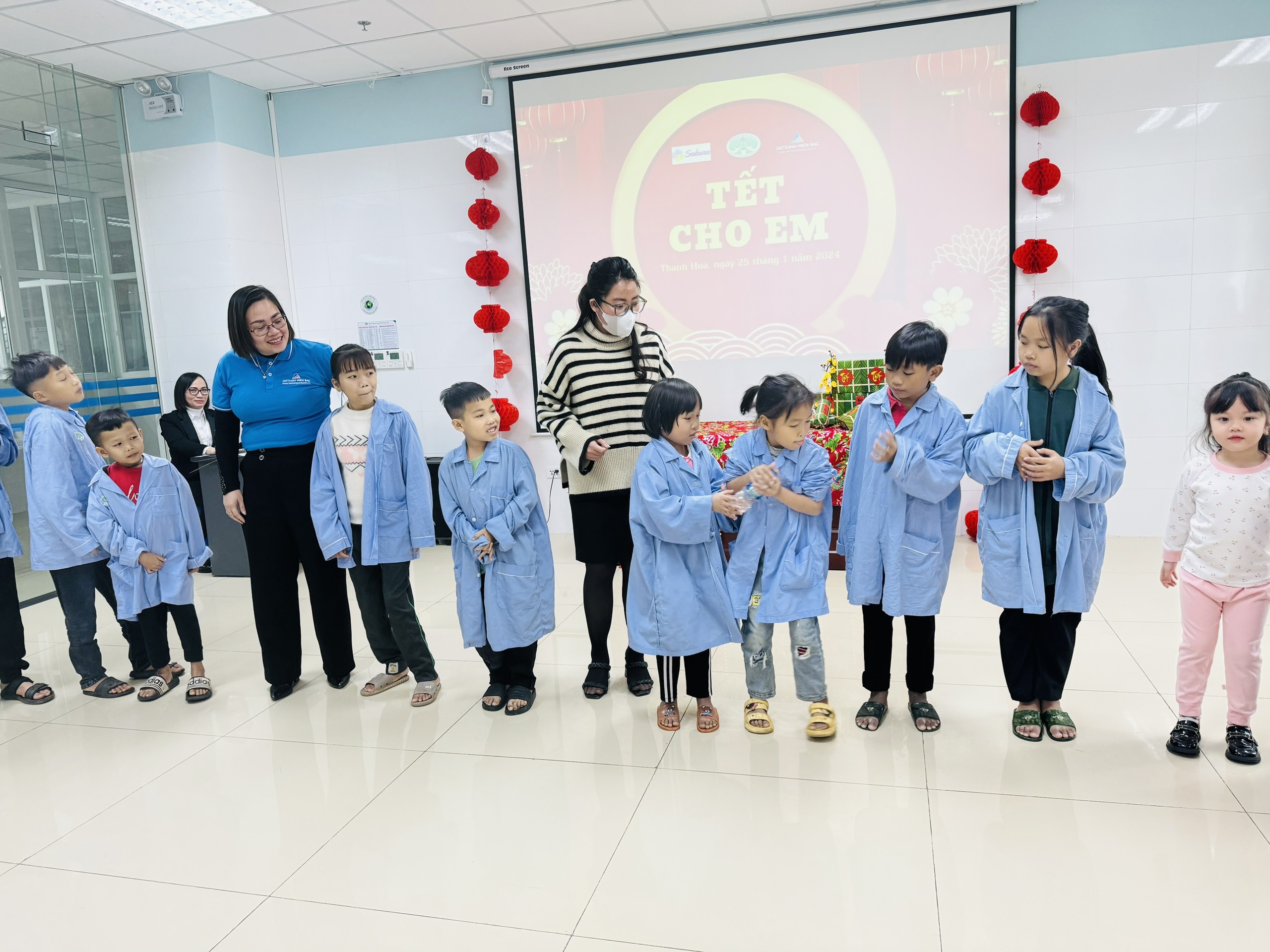 Nhân dịp năm mới và chào đón Tết Nguyên đán Giáp Thìn 2024, với mong muốn được chia sẻ khó khăn, phát huy tinh thần tương thân tương ái tới những hoàn cảnh khó khăn nhân dịp Tết đến xuân về, chiều ngày 25/01, Trường Mầm non Quốc tế Sakura cùng Công ty Cổ phần bất động sản Bắc bộ (thành viên Đất Xanh Miền Bắc) phối hợp với phòng Công tác xã hội – Bệnh viện Đa khoa tỉnh Thanh Hóa tổ chức chương trình “Tết cho em” dành cho các cháu bệnh nhân nhi đang điều trị tại Trung tâm Huyết học và Truyền máu.