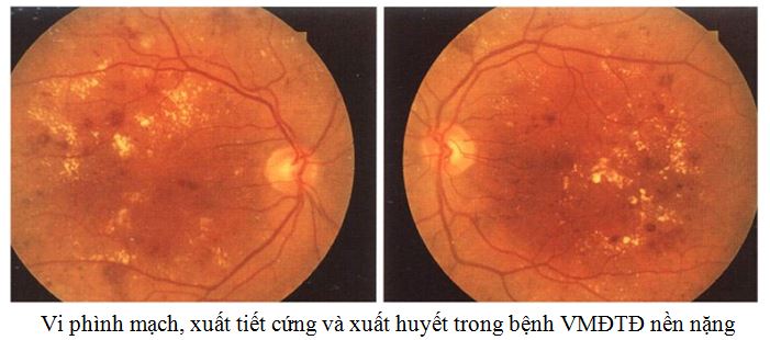 – Bệnh lý VMĐTĐ giai đoạn nền (BDR): vi phình mạch có thể quan sát trên lâm sàng đầu tiên, xuất huyết trong võng mạc, xuất tiết cứng, phù võng mạc. BDR không cần điều trị laser, tái khám hằng năm và điều chỉnh các yếu tố nguy cơ như cao huyết áp, thiếu máu, suy thận