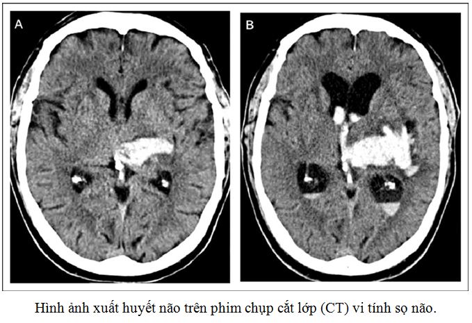 Chẩn đoán đột quỵ xuất huyết não thế nào? Nếu bệnh nhân có một số triệu chứng của đột quỵ não, bác sĩ sẽ thực hiện khám chuyên khoa thần kinh, làm các xét nghiệm và chụp hình ảnh não để xác định chắc chắn xuất huyết não, vì nhồi máu não cũng có triệu chứng tương tự. Chụp cắt lớp vi tính (CT) sọ não là phương pháp rất tin cậy, chẩn đoán chính xác xuất huyết não, thời gian thực hiện nhanh (khoảng 5-10 phút). Ngoài ra, trên phim còn có thể phát hiện các tổn thương, bệnh lí khác trong não.