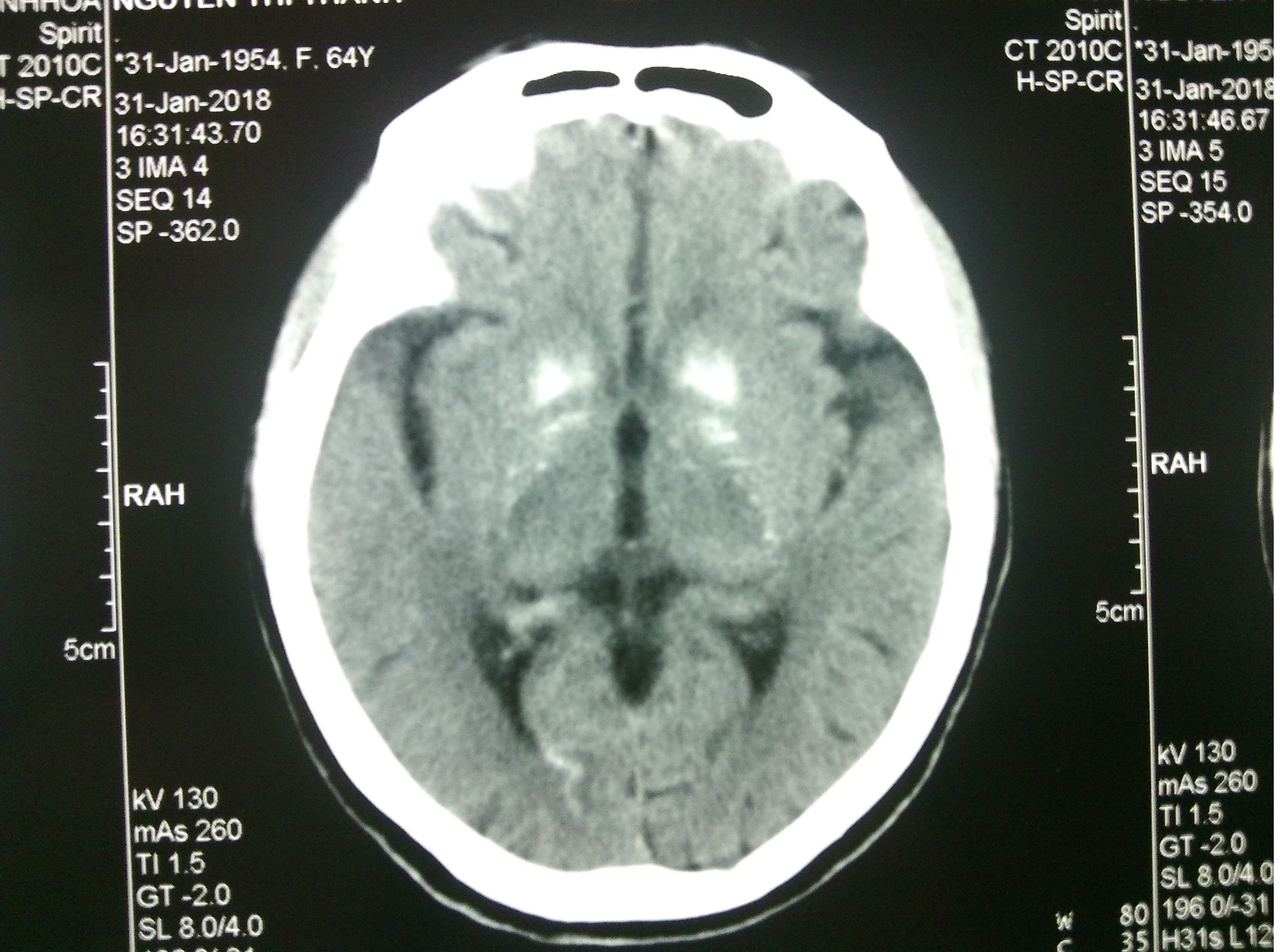 Bệnh nhân Nguyễn Thị Thanh 64 tuổi tiền sử cắt tuyến giáp cách 15 năm thỉnh thoảng có lên cơn hạ huyết calci huyết .Vào khoa tim mạch ngày 29/1/2018 với chẩn đoán tăng huyết áp / parkinson chụp cắt lớp vi tính sọ não có hình ảnh vôi hóa nhân nền sọ và riểu não hai bên hội chẩn chuyển khoa thần kinh điều trị ngày 31/1/2018 trong tình trạng loạn thần tăng trương lực cơ toàn thân, run 2 tay và 2 chân và đươc điều trị theo phác đồ hạ huyết áp bằng lợi tiều, ức chế men chuyển, Madopar