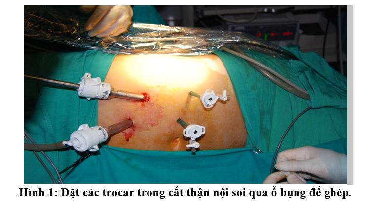 Bệnh nhân nằm nghiêng trái 900 có độn vùng thắt lưng, vai và hông cố định. Đặt trocar đầu tiên (12mm) theo phương pháp mở hoặc sử dụng kim Veress bơm CO2 rồi mới đặt trocar, điểm đặt trocar đầu tiên ở ngang rốn trên đường giữa đòn phải. Duy trì bơm CO2 với áp lực 10-12mmHg. Dưới quan sát của ống kính soi, đặt tiếp các trocar tại các vị trí như hình 1, bao gồm: 1 trocar 12mm và 2 trocar 5,4mm. Rạch và bóc mạc Toldt từ mức ngang động mạch chậu đi lên trên góc gan, hạ đại tràng lên, đại tràng góc gan để di động tối đa và đẩy đại tràng vào trong, phẫu tích đẩy tiếp tá tràng vào trong bộc lộ cân Gerota, cơ Psoas, mặt trước thận và tĩnh mạch chủ dưới. Bộc lộ niệu quản xuống qua đoạn bắt chéo động mạch chậu, bóc tách niệu quản, kẹp và cắt bằng Clip titanium hoặc Hem-o-lock. Giải phóng thận khỏi khoang thận. Kẹp cắt động-tĩnh mạch thận bằng Clip titanium và Hem-o-lock, riêng tĩnh mạch thận kẹp cắt bằng dụng cụ cắt nối máy nội soi (Endo-GIA). Lấy thận ghép ra ngoài qua đường rạch hố chậu phải (dài khoảng 5cm).