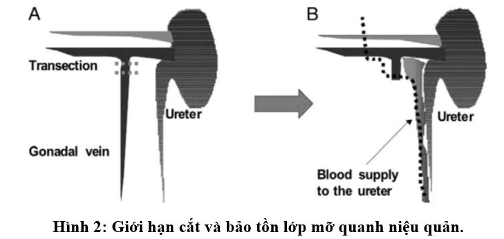 Tìm và xử lý niệu quản được chúng tôi bắt đầu từ ngang cực dưới thận, đi xuống giải phóng và cắt niệu quản ở ngang mức dưới chỗ bắt chéo mạch chậu. Chúng tôi không gặp trường hợp nào bị niệu quản ngắn do cắt ở mức cao hơn chỗ bắt chéo mạch chậu, các niệu quản đều đủ để khâu nối được bằng cách trồng niệu quản-bàng quang kiểu Lich-Gregoire. Theo Nogueira M (2005), Chung Hsiao-Jen (2009) và Breda A (2006), mức cắt niệu quản phải ở dưới chỗ bắt chéo mạch chậu thì mới đủ độ dài để ghép. Song song, việc giữ lại lớp mỡ quanh niệu quản và lớp mỡ giữa niệu quản với tĩnh mạch sinh dục cũng rất quan trọng, bởi vì đa số các mạch nuôi niệu quản đều xuất phát từ đây, nếu lấy đi lớp mỡ này thì nguy cơ hẹp niệu quản sau ghép là đáng kể [5, 7, 10].