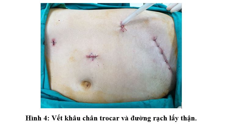 Vị trí đặt các trocar hiện cũng có nhiều cách: kiểu chữ L, kiểu hình kim cương … Các bệnh nhân trong nghiên cứu này, chúng tôi đặt 3-4 trocar theo kiểu hình bình hành hoặc chữ L (hình2), Bollens R (2009) cho rằng đây là cách đặt trocar thuận lợi hơn cả cho cắt thận nội soi qua ổ bụng để ghép [6, 7, 10].