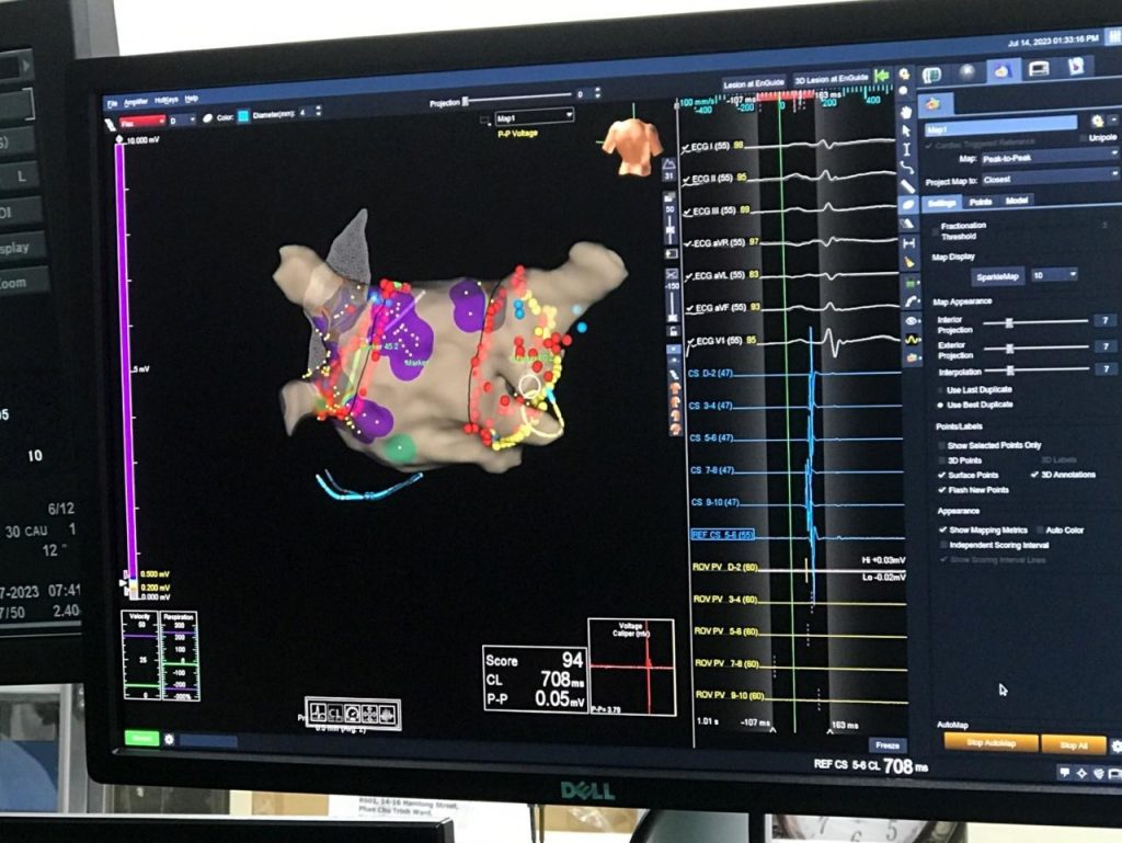 Sau khi hội chẩn và đánh giá kỹ lưỡng tình trạng bệnh của bệnh nhân, dưới sự hỗ trợ của các chuyên gia Viện Tim mạch, Bệnh viện Bạch Mai, ngày 14-7-2023 ê kip các bác sỹ Đơn vị Can thiệp mạch, Bệnh viện Đa khoa tỉnh Thanh Hoá đã thực hiện triệt đốt rung nhĩ cho cả 2 bệnh nhân bằng năng lượng sóng tần số radio sử dụng hệ thống lập bản đồ 3D giải phẫu, điện học buồng tim.