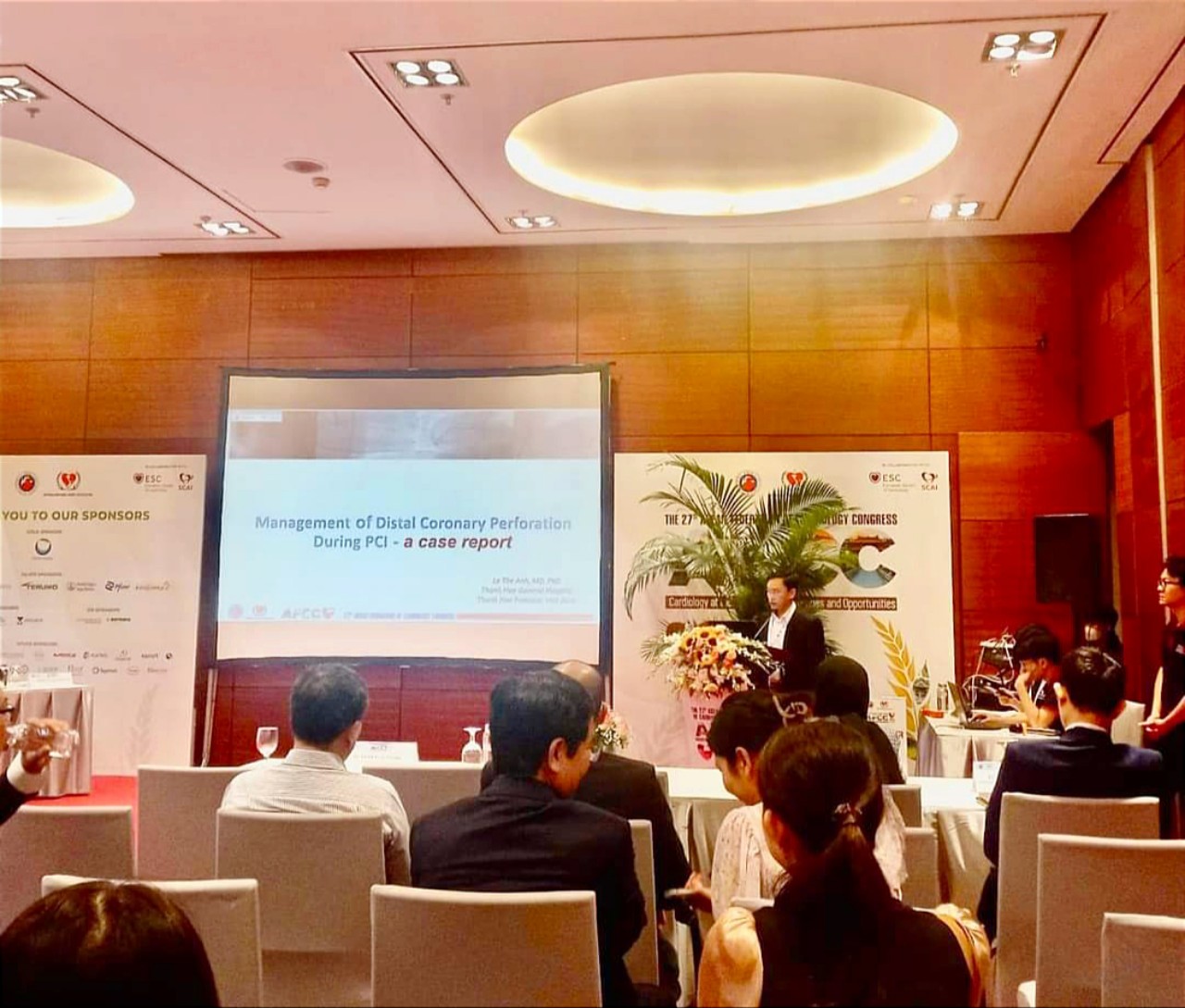 Tiến sĩ, bác sĩ Lê Thế Anh – Trưởng khoa Nội Tim mạch trình bày báo cáo bằng tiếng Anh chủ đề: “Manegement of distal coronary perforation during PCI: A case report – Ca lâm sàng xử trí thủng động mạch vành đoạn xa khi can thiệp” tại Đại hội