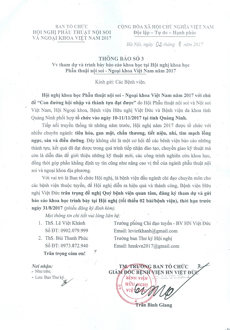 Thông báo: Đăng ký tham dự và trình bày báo cáo tại Hội nghị khoa học Phẫu thuật nội soi – Ngoại khoa Việt Nam năm 2017 Tài liệu đi kèm:Mẫu đăng ký tham dự và trình bày báo cáo