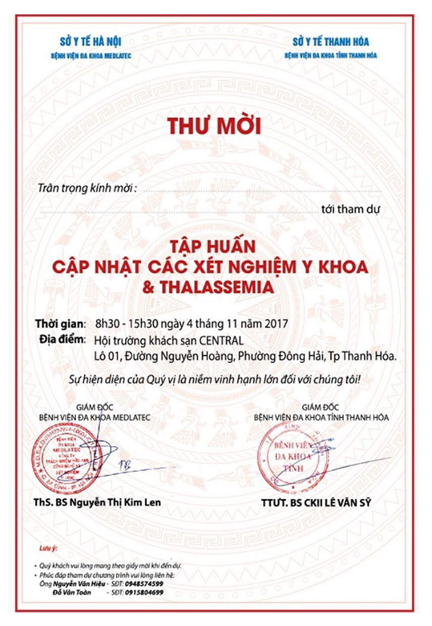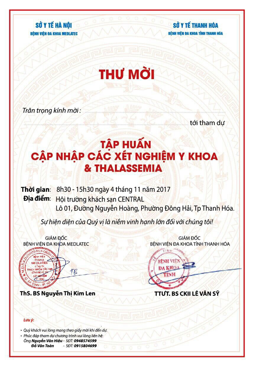 Thư mời: Tập huấn cập nhật các xét nghiệm y khoa & Thalassemia