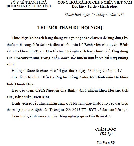 Thư mời tham dự hội nghị chuyên đề ứng dụng của Procanxitonine trong chẩn đoán sốc nhiễm khuẩn và điều trị kháng sinh