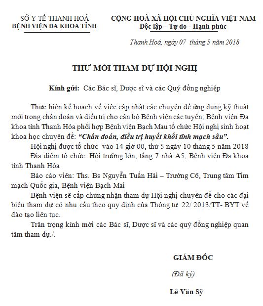 Thư mời tham dự hội nghị khoa học chuyên đề: Chẩn đoán, điều trị huyết khối tĩnh mạch sâu