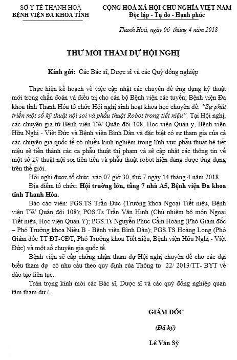 Thư mời tham dự Hội nghị khoa học chuyên đề: Sự phát triển một số kỹ thuật nội soi và phẫu thuật robot trong tiết niệu