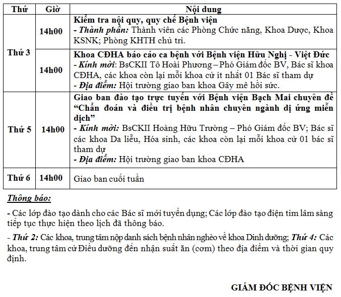 Lịch công tác tuần từ ngày 01/10/2018 đến 05/10/2018