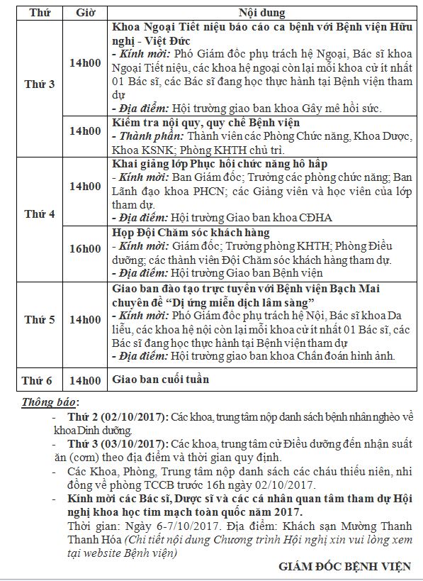 Lịch công tác tuần từ ngày 02/10/2017 đến ngày 06/10/2017 Tài liệu đi kèm:Lịch tuần từ ngày 02/10/2017 đến ngày 06/10/2017