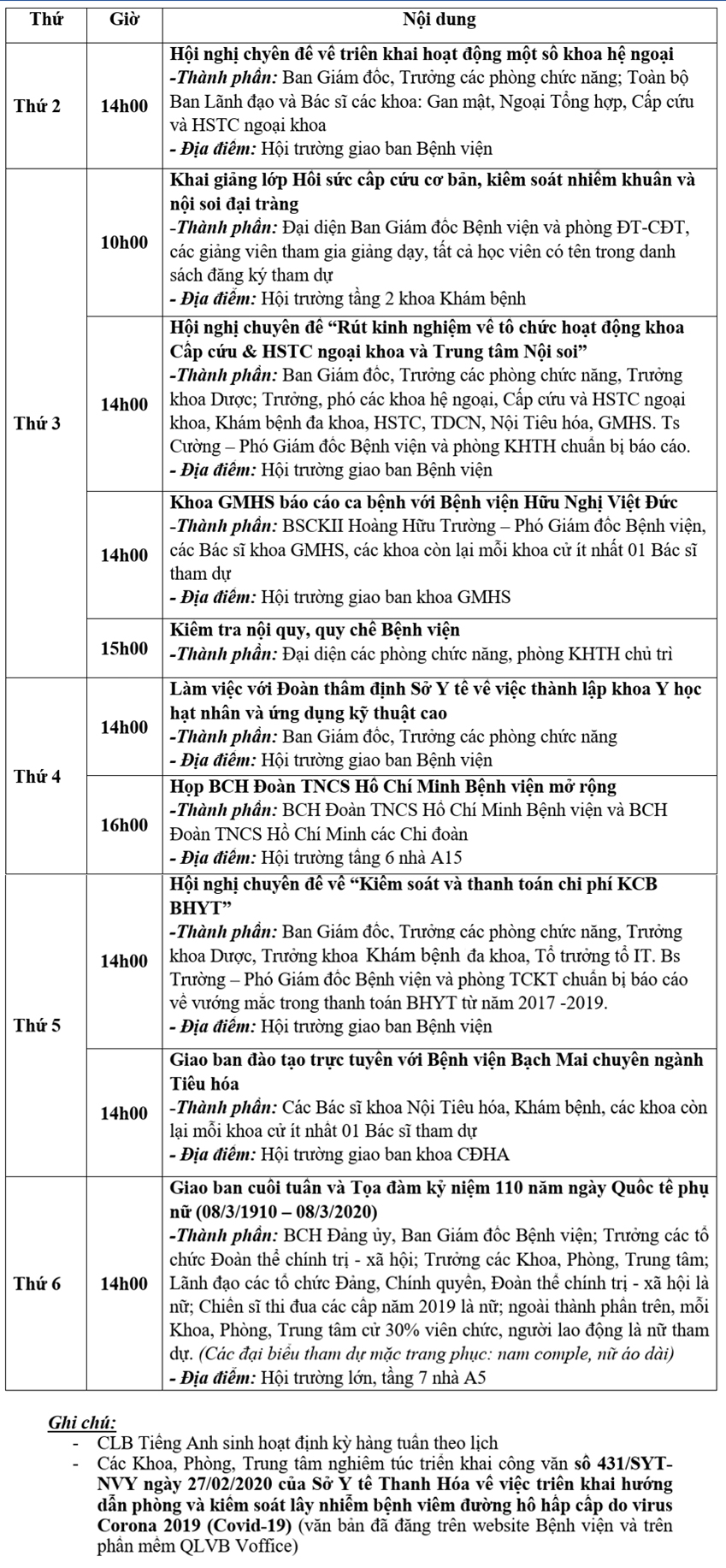 Lịch công tác tuần từ ngày 02/3/2020 đến ngày 06/3/2020 Tài liệu đi kèm:Lịch công tác tuần (File word)