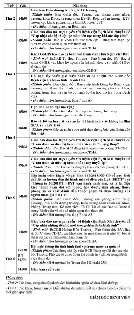 Lịch công tác tuần từ ngày 03/12/2018 đến 07/12/2018