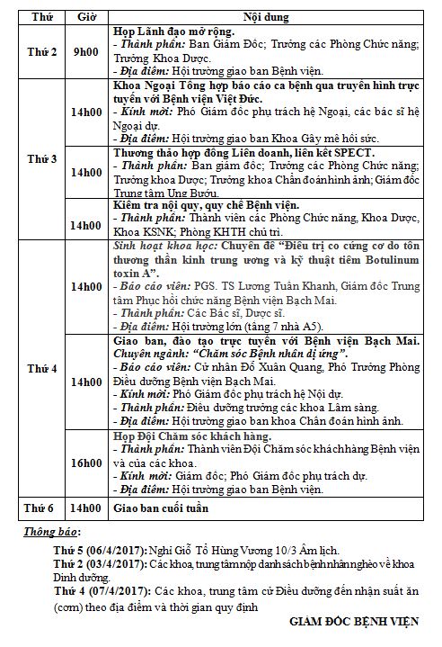 Lịch công tác tuần từ ngày 03/4/2017 đến ngày 07/4/2017