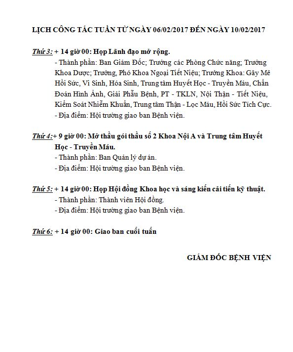 Lịch công tác tuần từ ngày 06/02/2017 đến ngày 10/02/2017