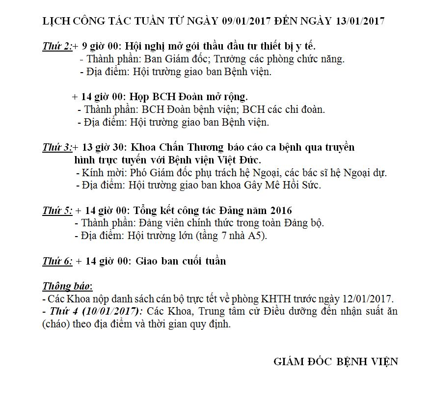 Lịch công tác tuần từ ngày 09/01/2017 đến ngày 13/01/2017