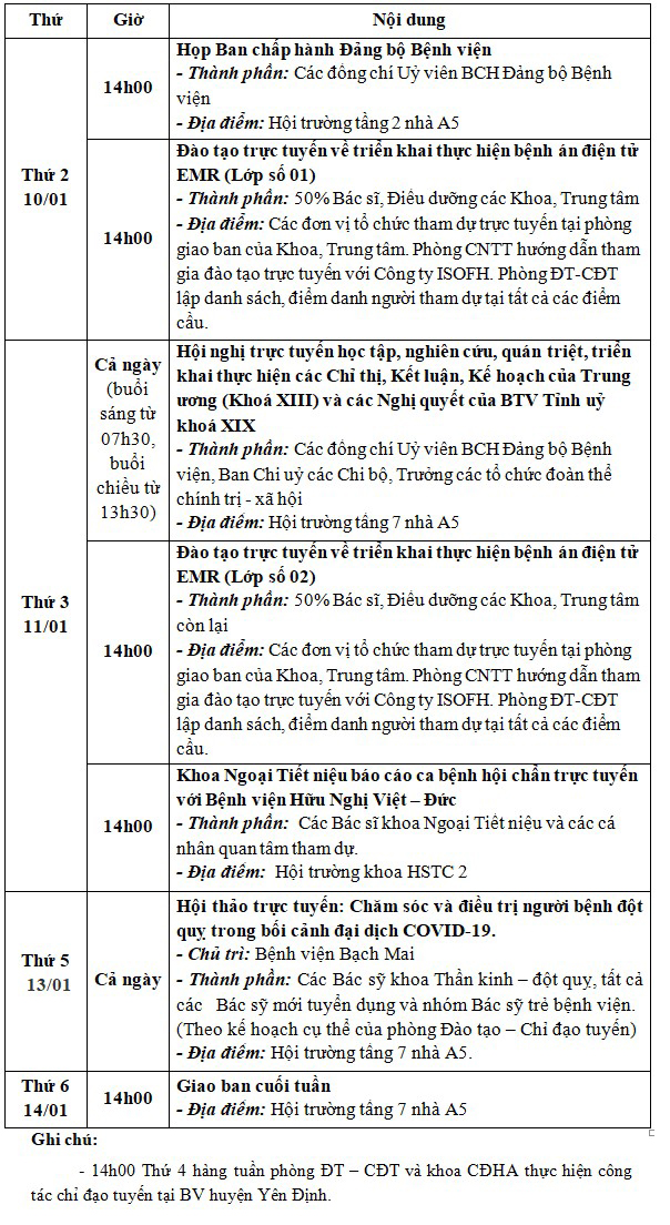 Lịch công tác tuần từ ngày 10/01/2022 đến ngày 14/01/2022 Tài liệu đi kèm:Lịch công tác tuần (File word)