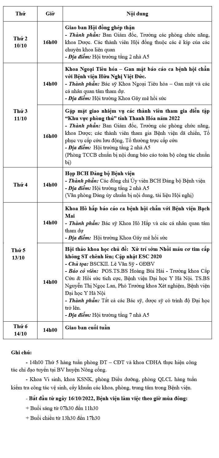 Lịch công tác tuần từ ngày 10/10/2022 đến ngày 14/10/2022