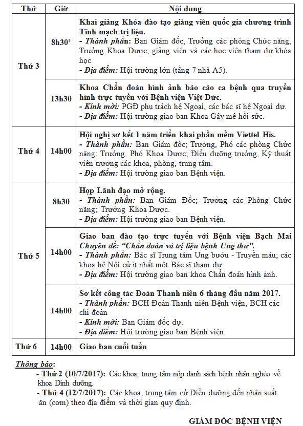 Lịch công tác tuần từ ngày 10/7/2017 đến ngày 14/7/2017