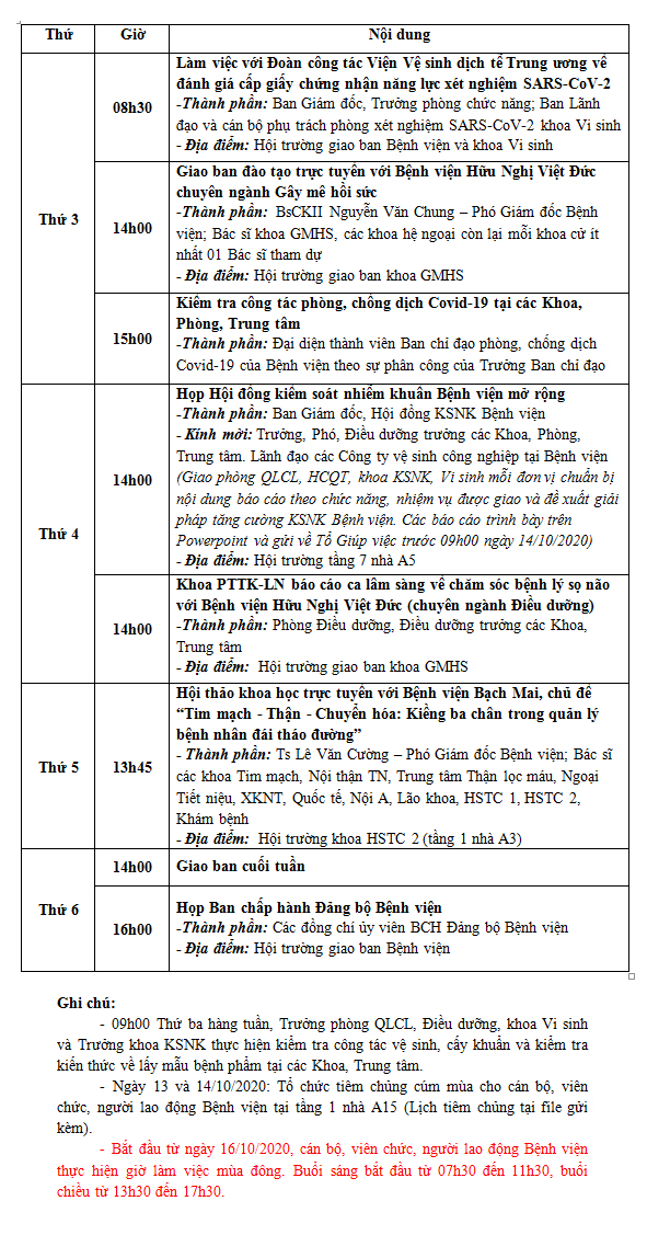 Lịch công tác tuần từ ngày 12/10/2020 đến ngày 16/10/2020 Lịch tiêm chủng cúm mùa cho CBVC, người lao động Bệnh viện <– Click để xem chi tiết Tài liệu đi kèm:Lịch công tác tuần (File word)