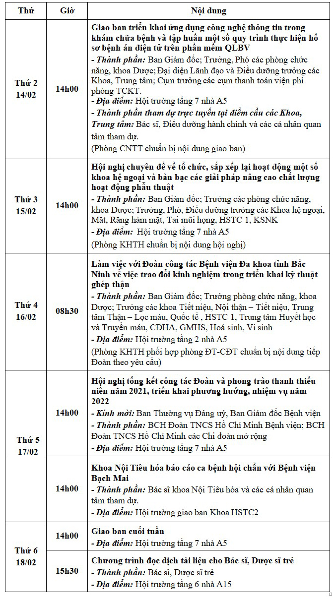 Lịch công tác tuần từ ngày 14/02/2022 đến ngày 18/02/2022 Tài liệu đi kèm:Lịch công tác tuần (File word)