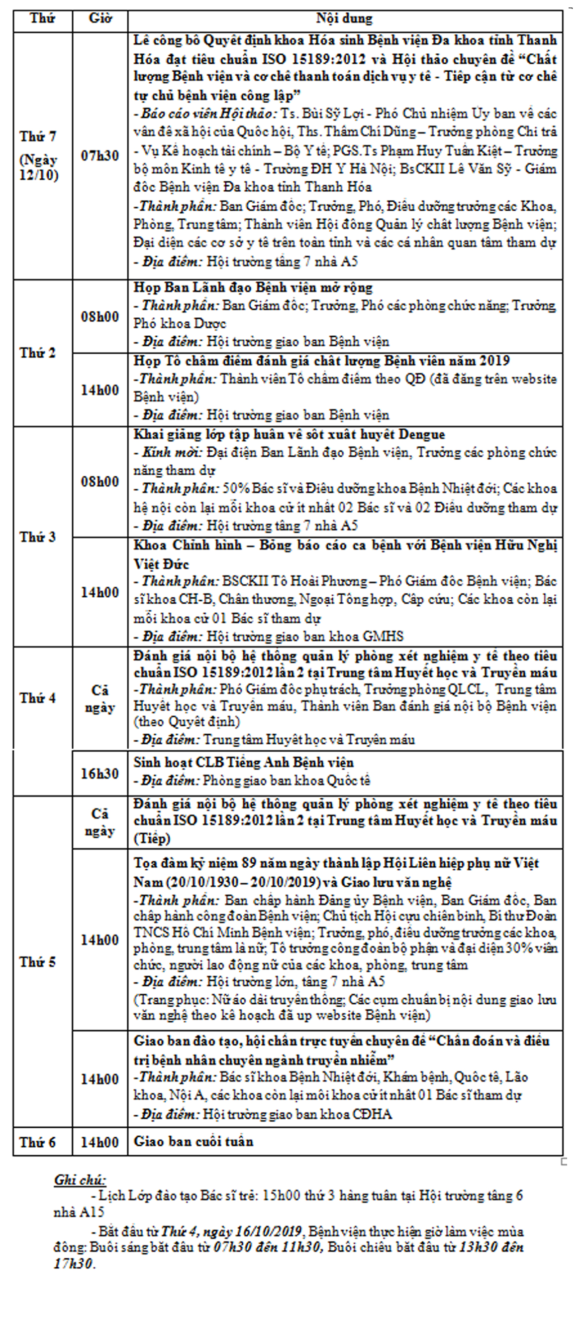 Lịch công tác tuần từ ngày 14/10/2019 đến 18/10/2019
