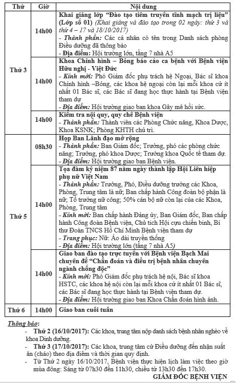 Chú ý: các học viên lớp “Đào tạo tiêm truyền tĩnh mạch” học 02 Ngày lý thuyết trên hội trường lớn Tầng 7 nhà A5 và 01 ngày học thực hành tại khoa vào 14h00 ngày Thứ 5