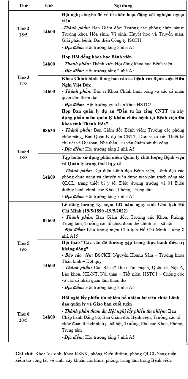 Lịch công tác tuần từ ngày 16/5/2022 đến ngày 20/5/2022 Tài liệu đi kèm:Lịch công tác tuần (file word)