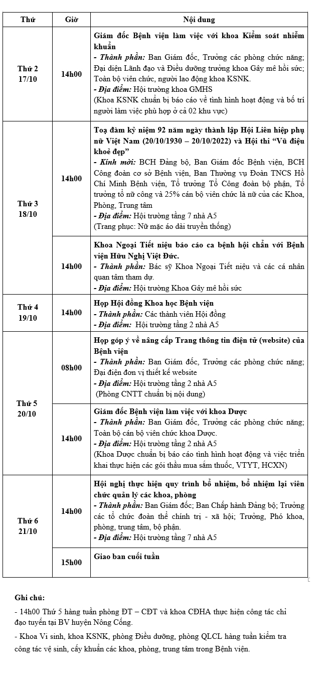 Lịch công tác tuần từ ngày 17/10/2022 đến ngày 21/10/2022 Tài liệu đi kèm:Lịch công tác tuần (File word)