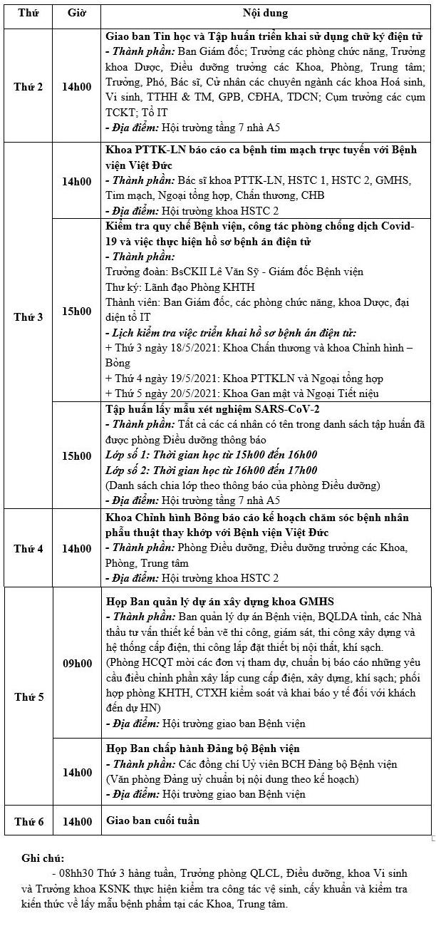 Lịch công tác tuần từ ngày 17/5/2021 đến ngày 21/5/2021 Tài liệu đi kèm:Lịch công tác tuần (file word)