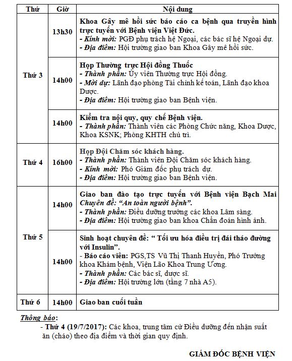 Lịch công tác tuần từ ngày 17/7/2017 đến ngày 21/7/2017