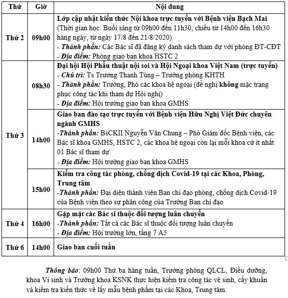 Lịch công tác tuần từ ngày 17/8/2020 đến ngày 21/8/2020 Tài liệu đi kèm:Lịch công tác tuần (file word)