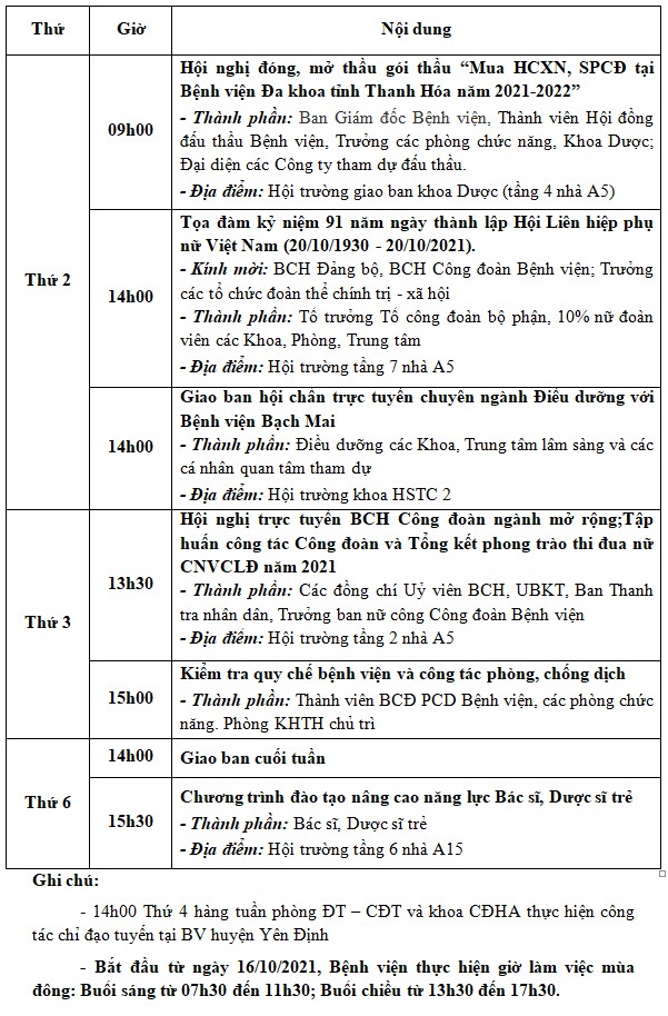 Lịch công tác tuần từ ngày 18/10/2021 đến ngày 22/10/2021 Tài liệu đi kèm:Lịch công tác tuần (File word)