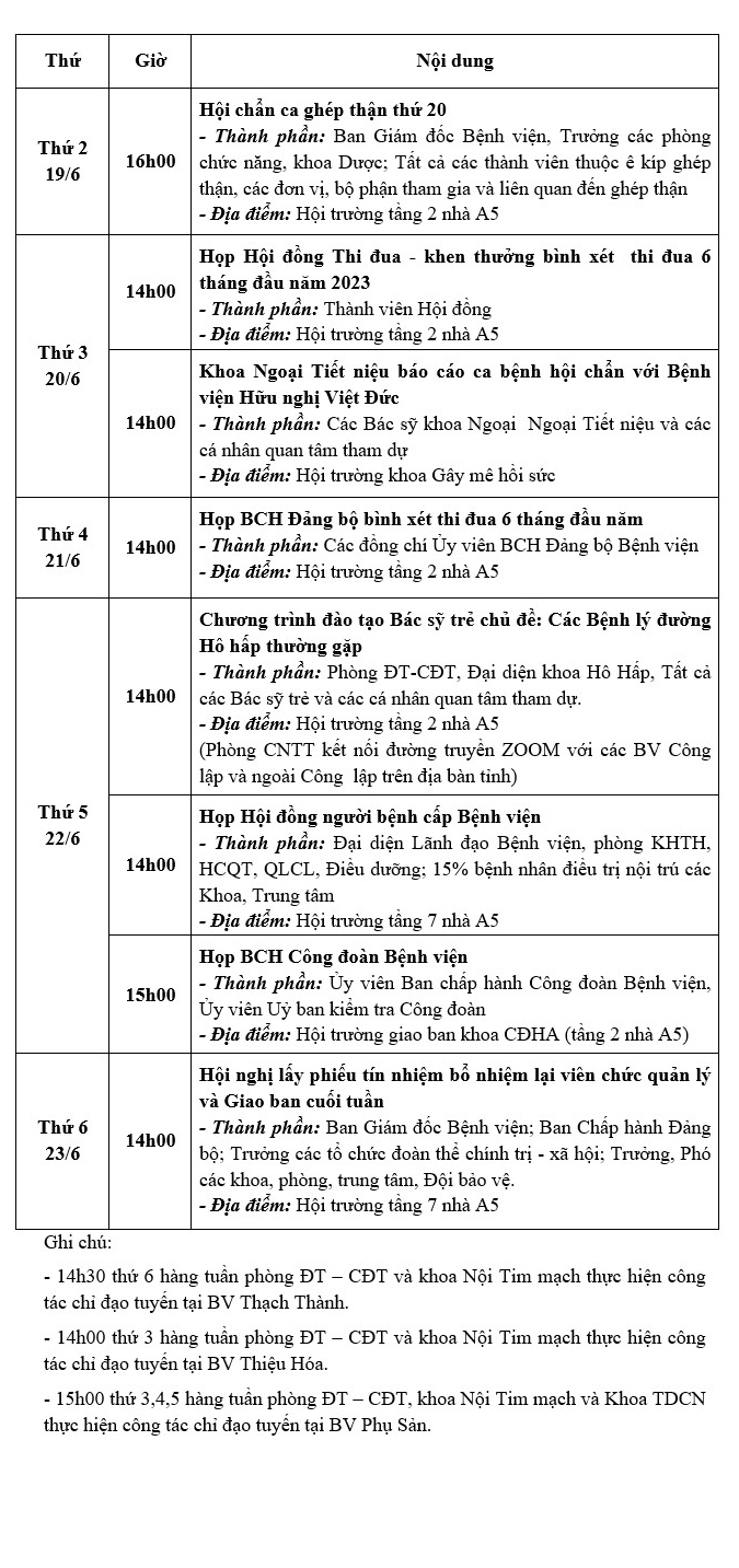 Lịch công tác tuần từ ngày 19/6/2023 đến ngày 23/6/2023 Tài liệu đi kèm:Lịch công tác tuần (File word)