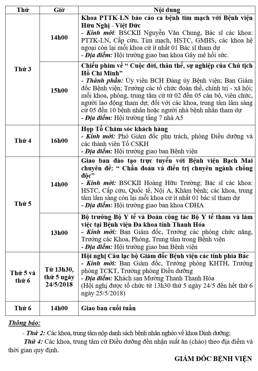 Lịch công tác tuần từ ngày 21/5/2018 đến ngày 25/5/2018 Tài liệu đi kèm:Lịch công tác tuần (file word)