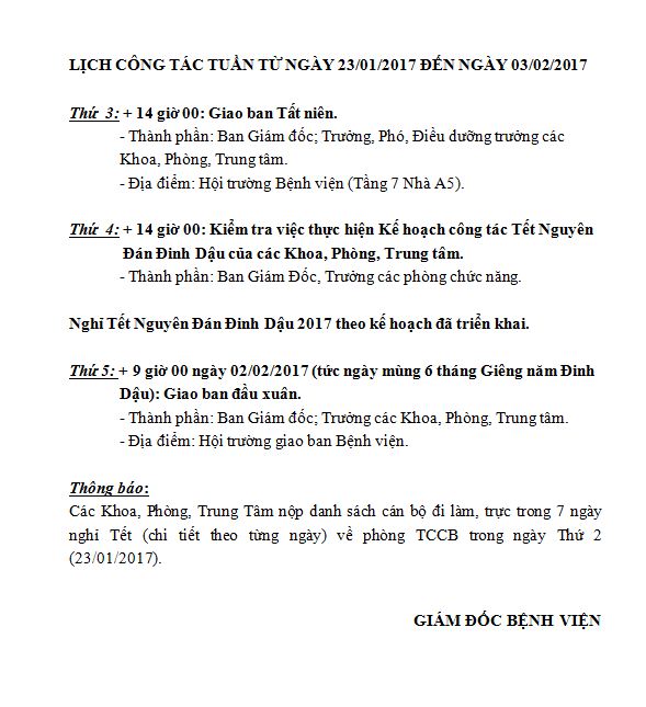 Lịch công tác tuần từ ngày 23/01/2017 đến ngày 03/02/2017
