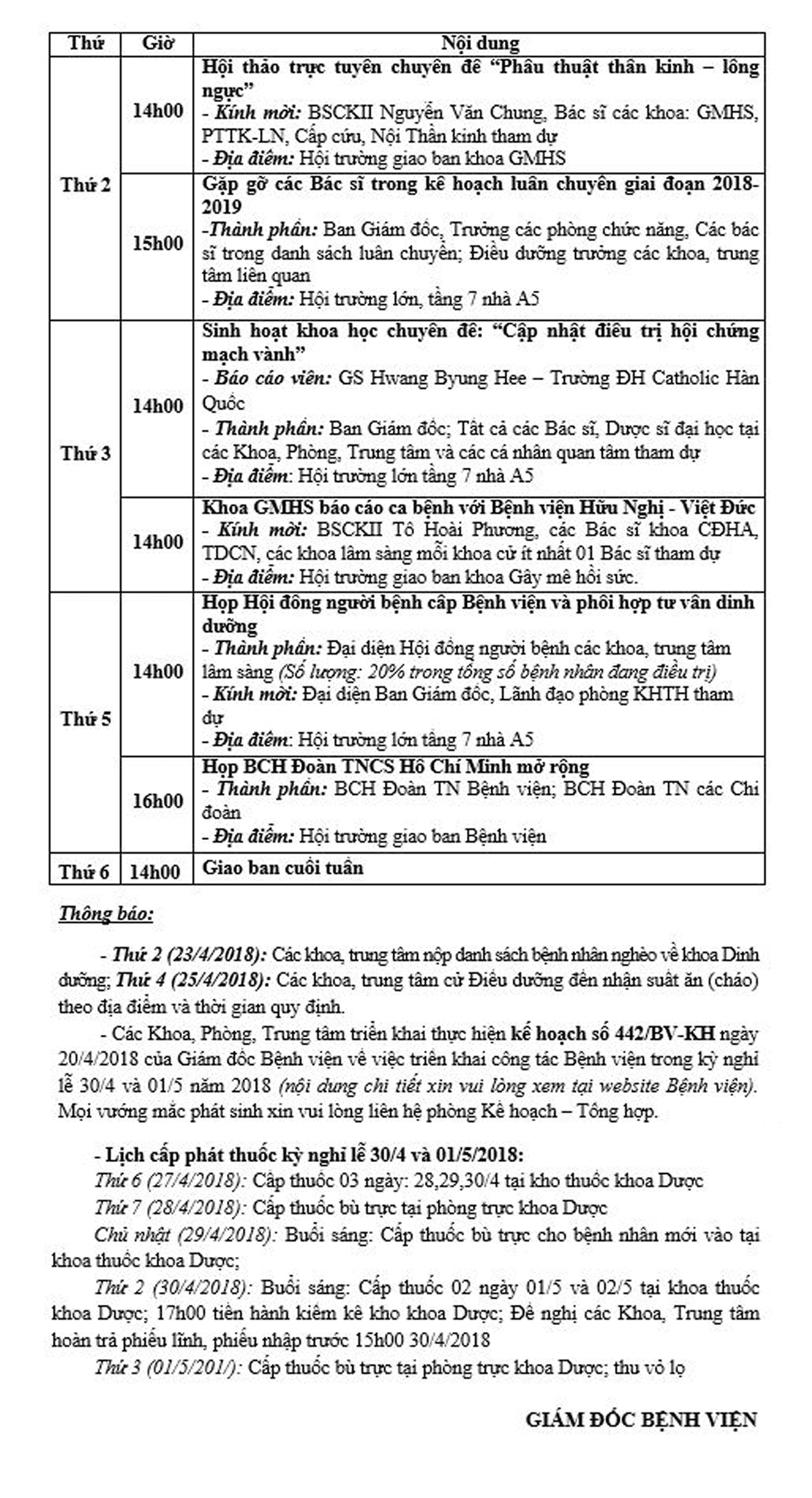 Lịch công tác tuần từ ngày 23/4/2018 đến ngày 01/05/2018 Tài liệu đi kèm:Lịch công tác tuần (file word)