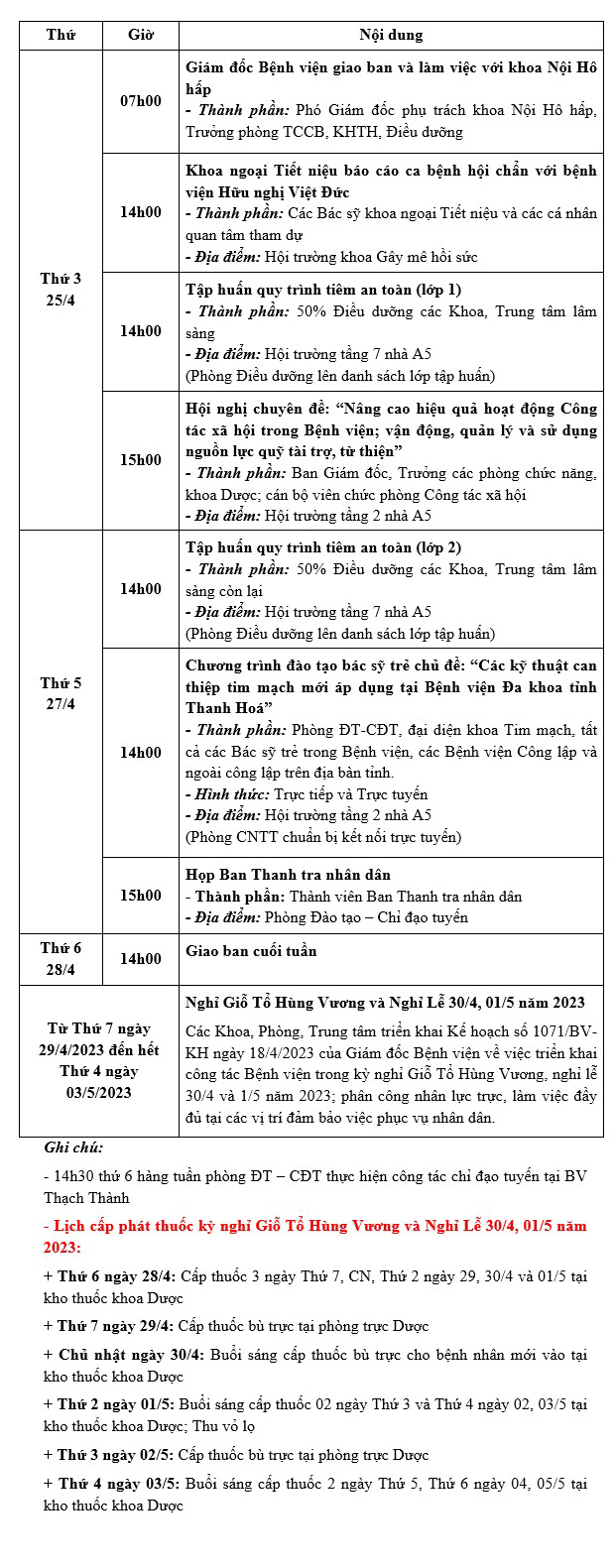 Lịch công tác tuần từ ngày 24/4/2023 đến ngày 28/4/2023 Tài liệu đi kèm:Lịch công tác tuần (File word)