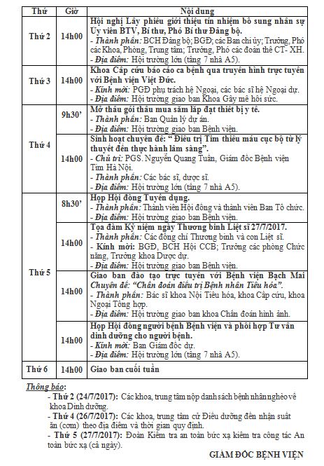 Lịch công tác tuần từ ngày 24/7/2017 đến ngày 28/7/2017
