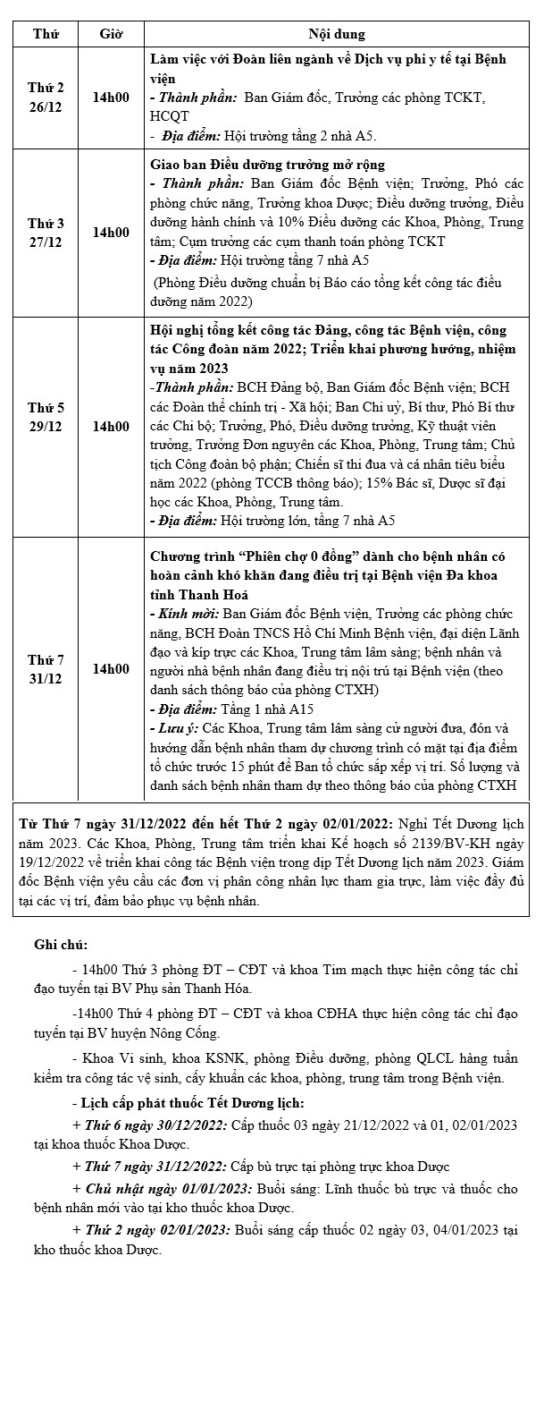 Lịch công tác tuần từ ngày 26/12/2022 đến ngày 02/01/2023 Tài liệu đi kèm:Lịch công tác tuần (File word)