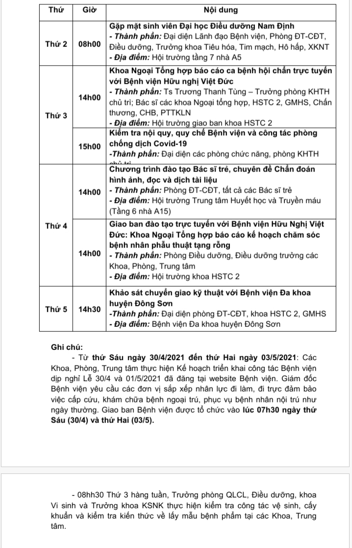 Lịch công tác tuần từ ngày 26/4/2021 đến 03/5/2021